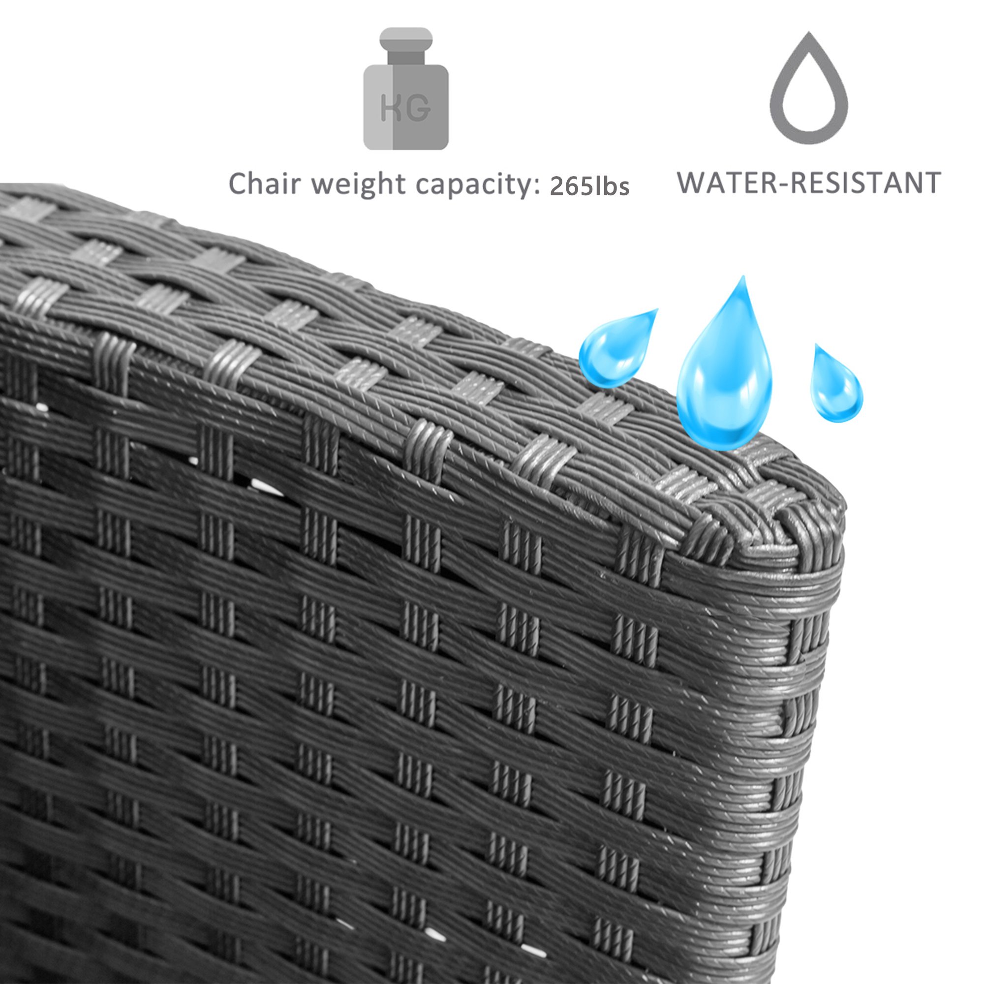 1.Durable & Sturdy: Constructed with durable powder-coated steel frames and woven water-resistant PE rattan to make the table and chairs durable enough for long time use. Perfectly highlights your patio or poolside décor.