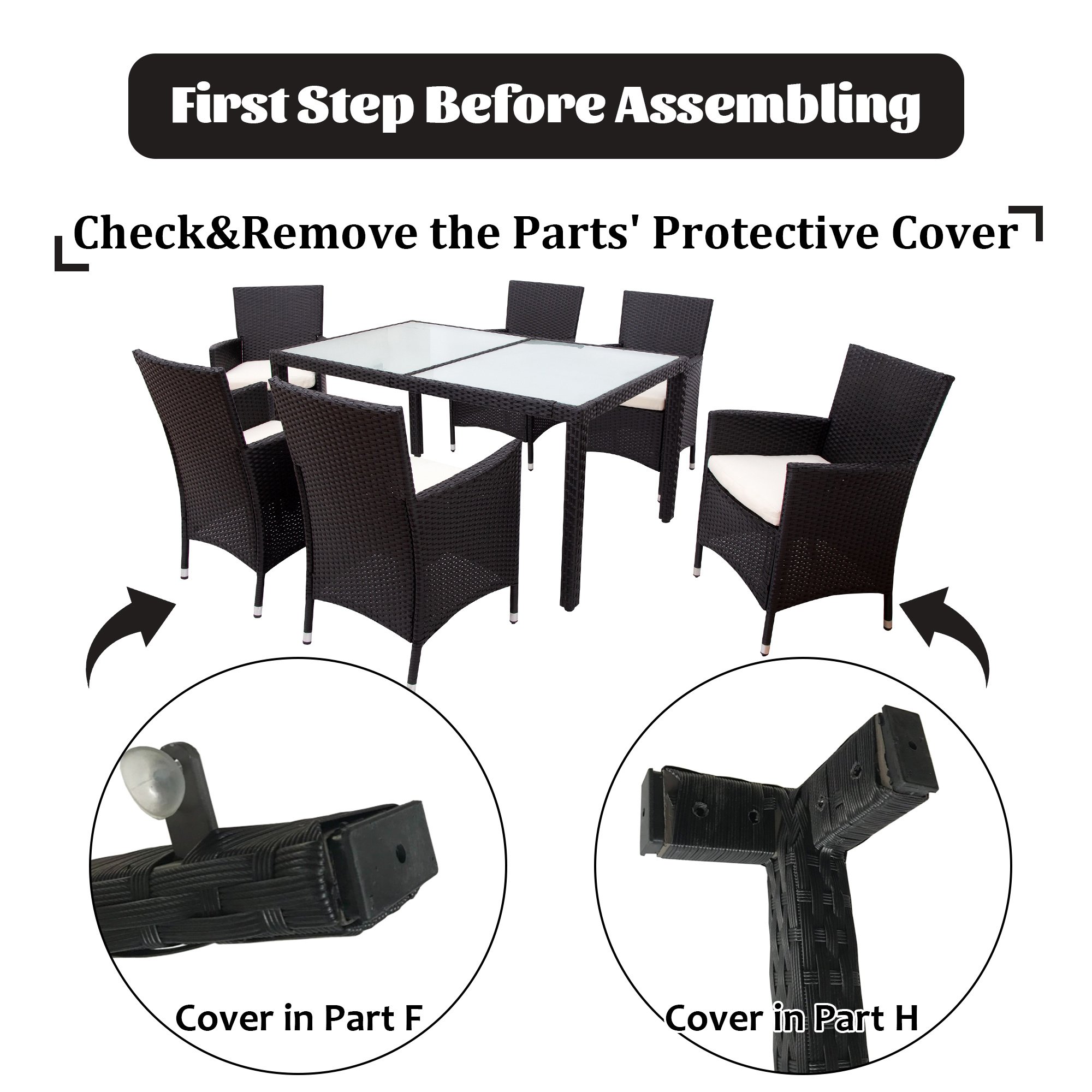 5.Dimensions and Warranty The set includes 6 armchairs (19.5” L x 20.1” W x 33.07” H); 1 table with glass top (59.06” L x 35.4” W x 29.13” H); Cushions are included giving you optimal comfort and relaxation. 3-box in total which may not come together. 12-month warranty. Warm notice: product's color may slightly differ from photo due to the light or your monitor's display. Please feel free to contact us if any issues.