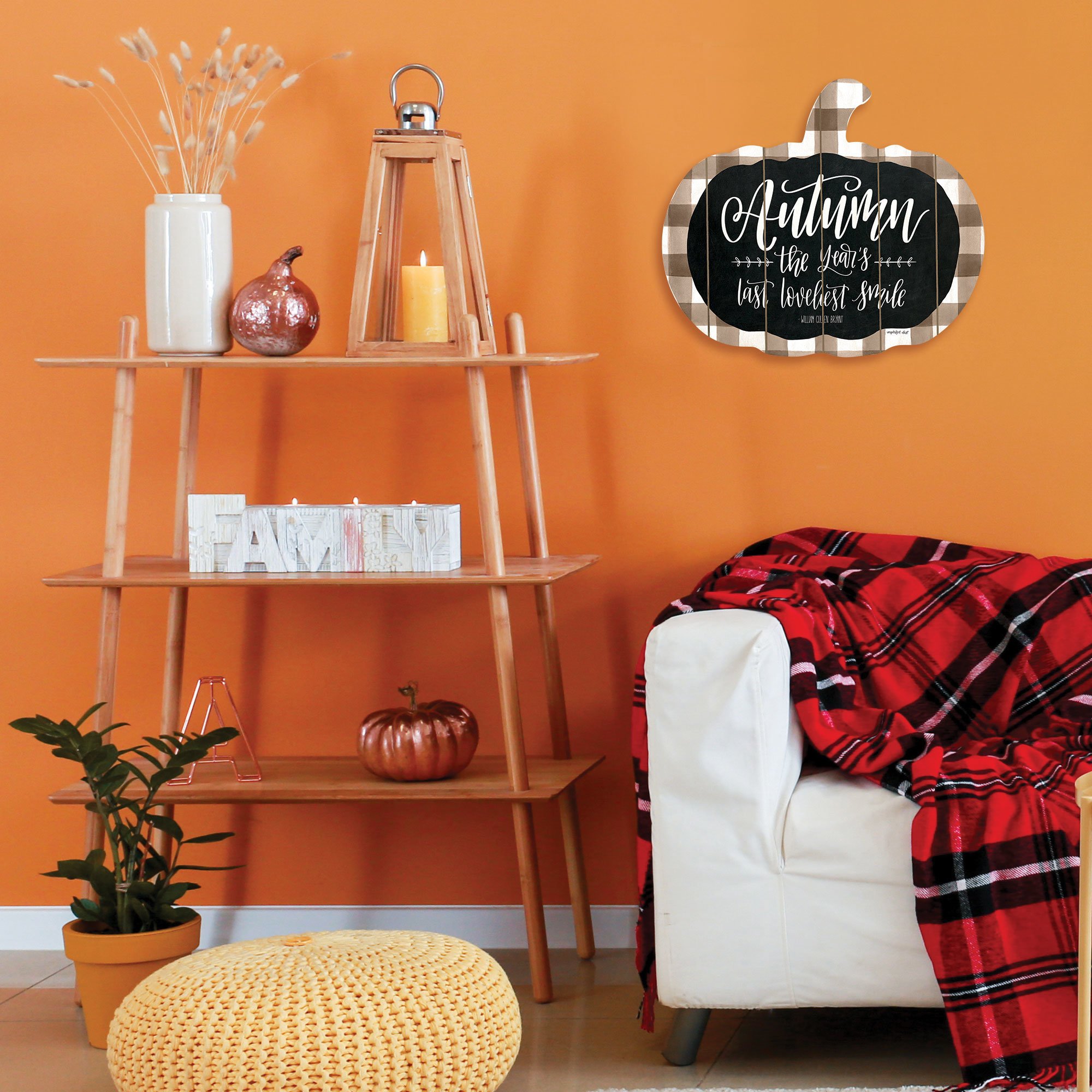 Autumn The Years Last Loveliest Smile by Imperfect Dust. This art printed on decorative wooden pumpkin cut out is 17.25x15. This decorative artwork features a traditional brown and white plaid pumpkin shadowed with a colorful pumpkin and a saying Autumn, the Years Last Loveliest Smile printed in white decorative script on a black background. Our products are proudly made by skilled American workers. All natural wood; keeping with our environmentally friendly approach toward manufacturing. Arrives ready to hang by a sawtooth hanger which is attached. •Print has fade resistant surface texture, no glass is necessary•Woman Owned Business (WBE)•Arrives ready to hang, no additional hardware needed on item•IndIvIdually hand crafted by skilled AmerIcan workers••Clean with Soft Dry Cloth Only (Made in U.S.A.)