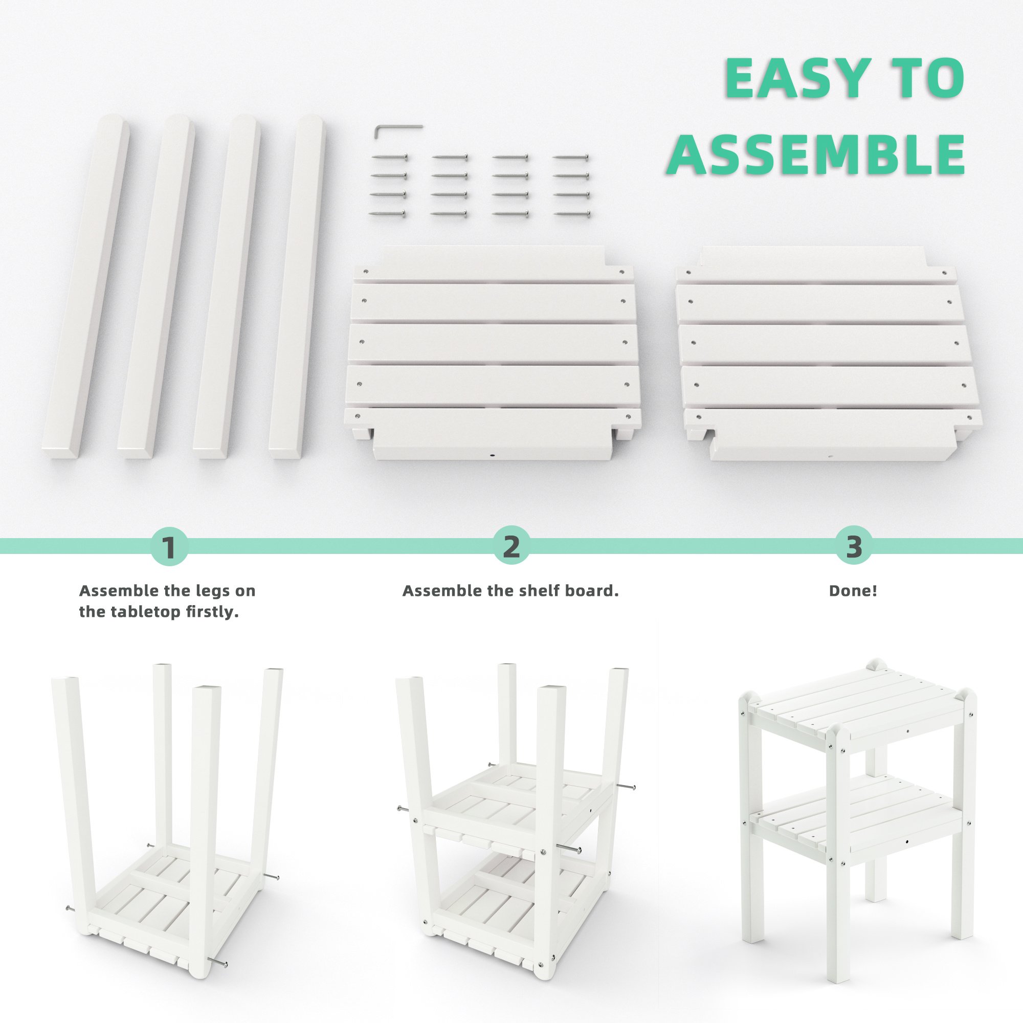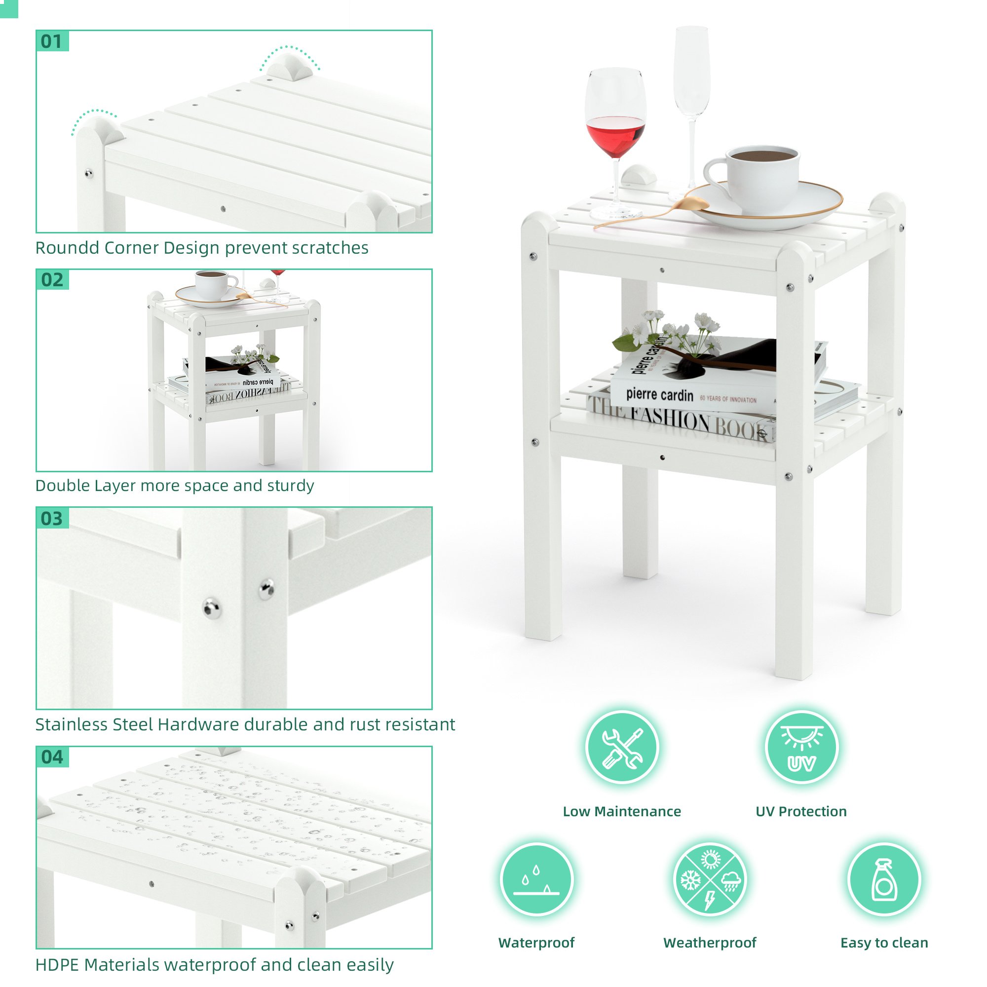 1.MATERIALS: The side table in HDPE (high density polyethylene) material and all parts connect together with stainless steel bolts hardware; Weather resistant and fade proof; waterproof. Easy to clean and long-lasting.