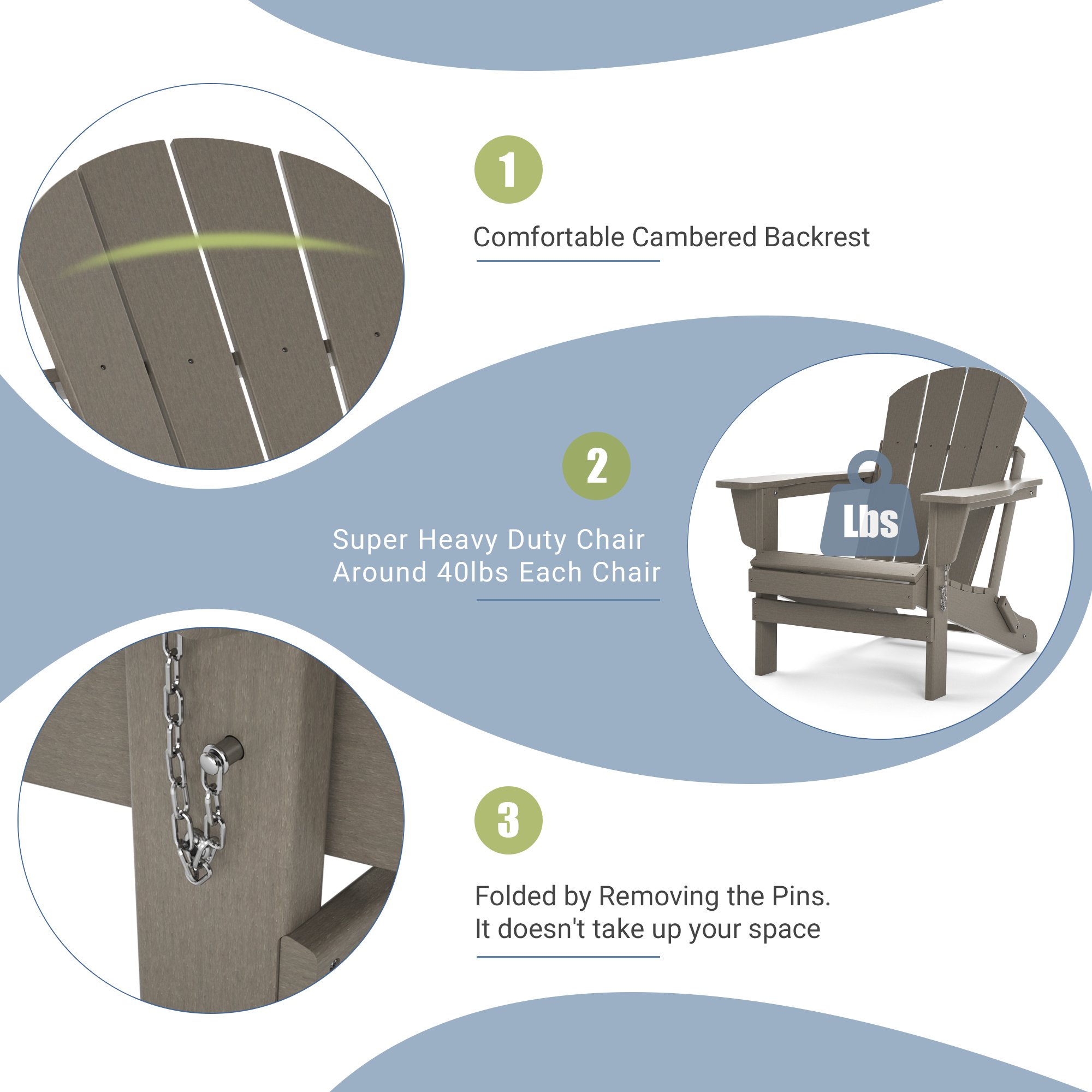 1.[Folding Adirondack Chairs] The Adirondack chair can be folded by removing the pins that are attached by a chain. It’s easy to operate. When you're not using it and doesn't take up your deck space. It is good for storage and easy to move.