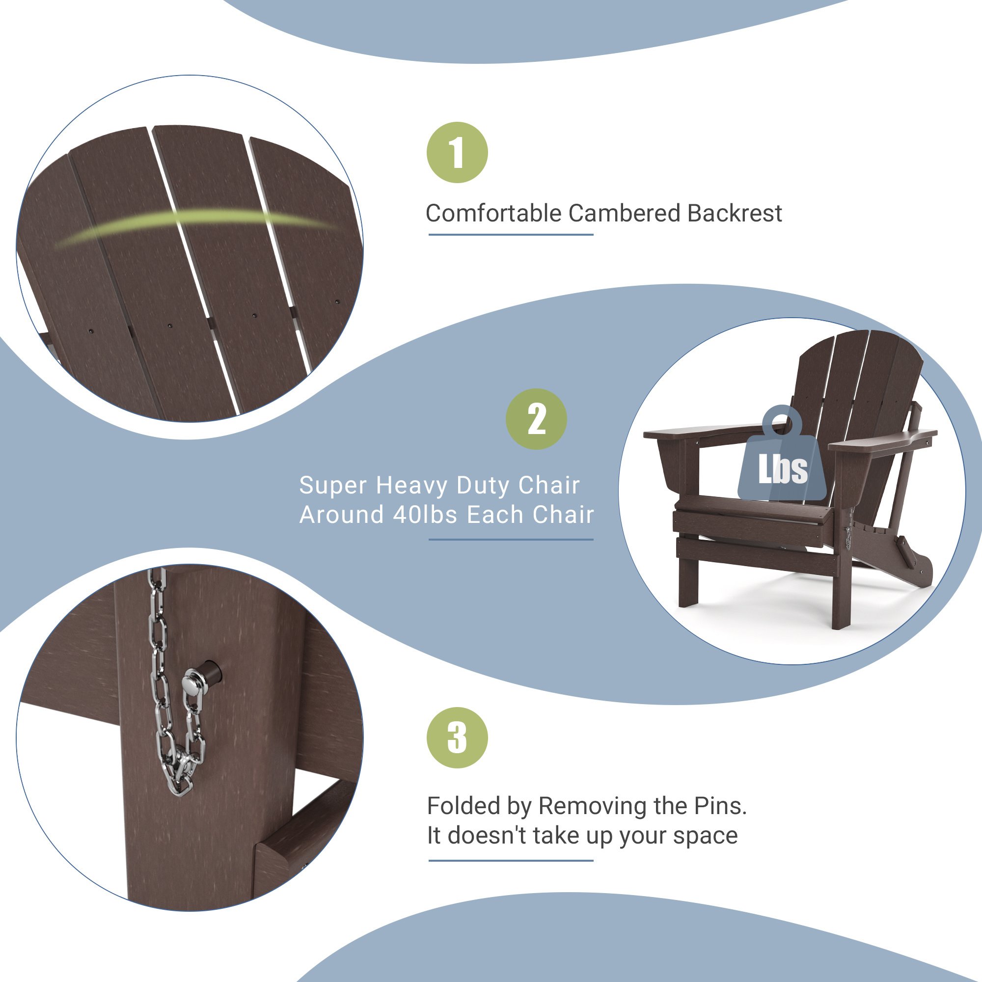 1.[Folding Adirondack Chairs] The Adirondack chair can be folded by removing the pins that are attached by a chain. It’s easy to operate. When you're not using it and doesn't take up your deck space. It is good for storage and easy to move.