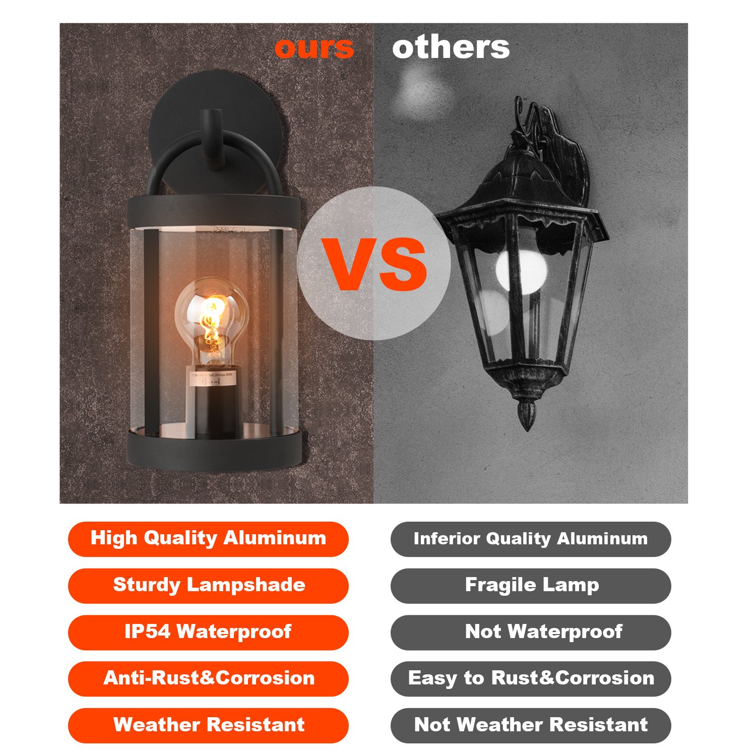 3.IP54 waterproof: all-weather resistant, wall sconces made of high quality aluminum, so anti-rust & corrosion. Never worry about rain, storm, sleet, snow, ultra high or low temperatures, this light fixture will still perfect after years of using.