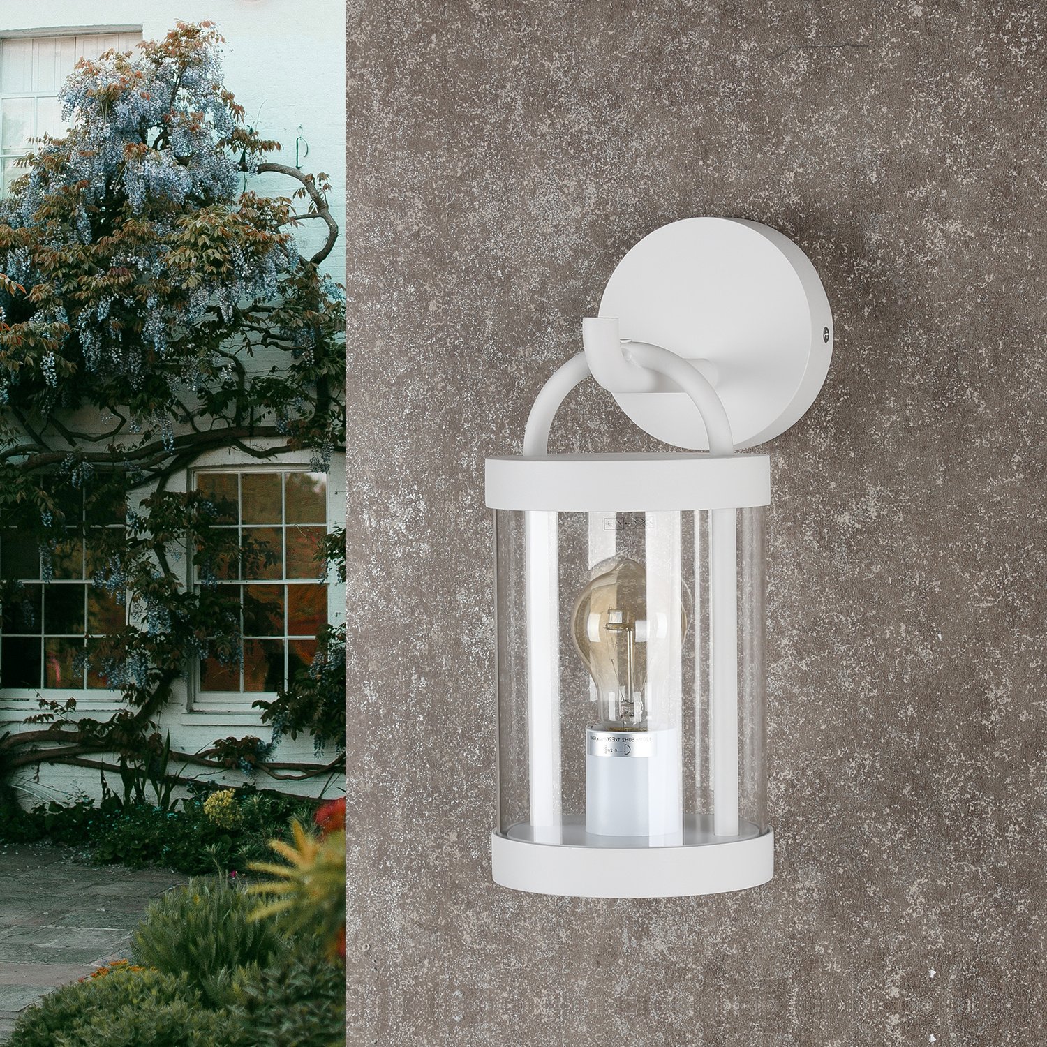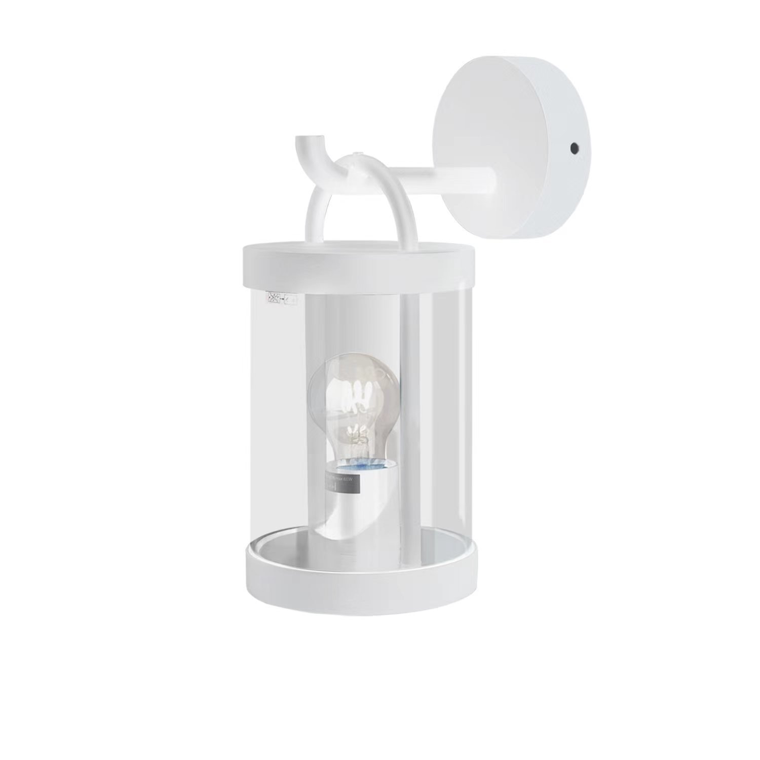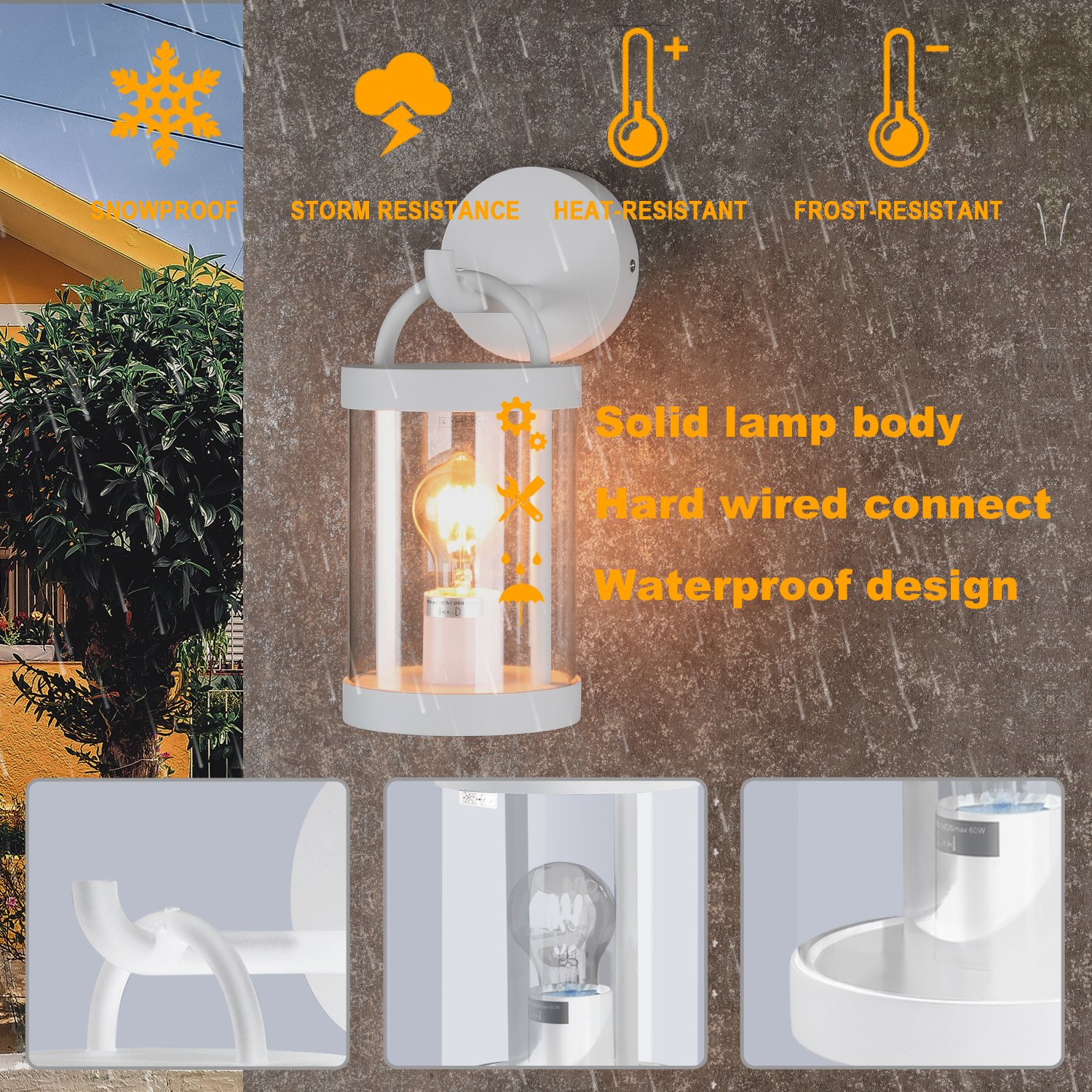 2.Lamp detail: the outdoor light is made of high-quality aluminum, the color is white, hard wired. Lamp size 4.92*7.32*12.99in. Lamp working voltage is 100-120V, Suitable for dimmable E26 bulbs with power lower than 60W.
