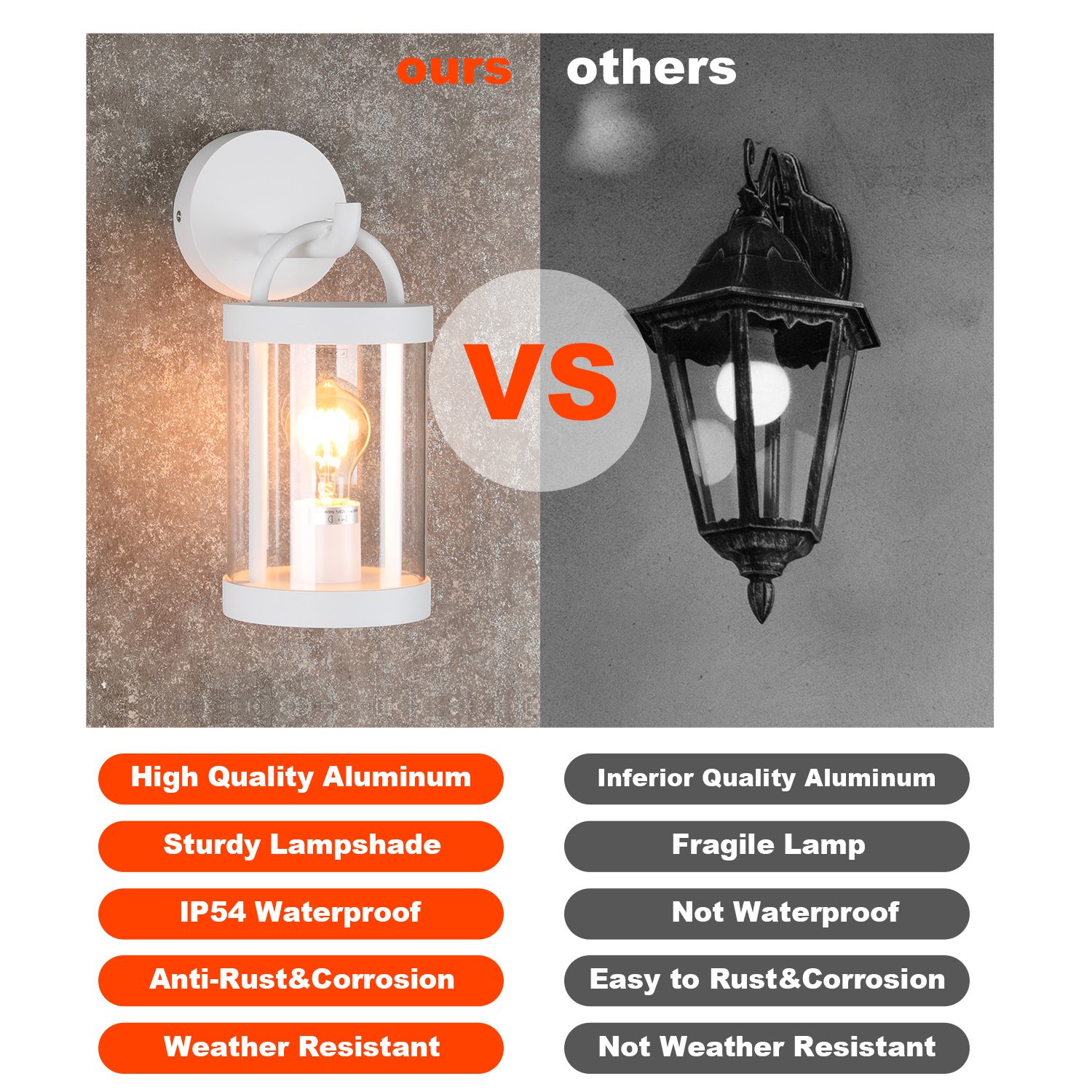 3.IP54 waterproof: all-weather resistant, wall sconces made of high quality aluminum, so anti-rust & corrosion. Never worry about rain, storm, sleet, snow, ultra high or low temperatures, this light fixture will still perfect after years of using.