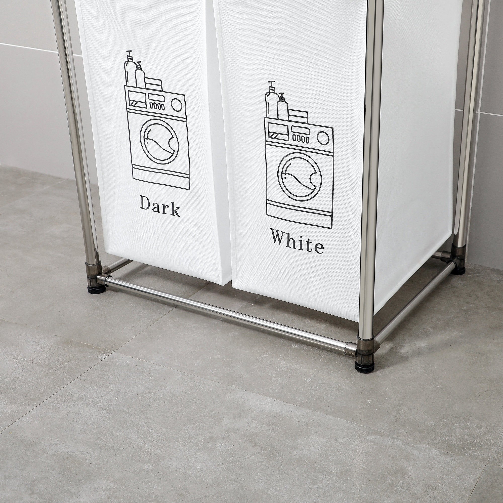 Description:SIZE AND LOAD BEARING: The size of the laundry hamper is: 22" L X 16.5" W X 34.6" H, and the size of laundry white bag is: 22"x 16.5"x 20.47",the size of laundry black bag is: 22"x 11.8"x11.8", Each laundry bag can hold up to 30 lbs.QUALITY CONSTRUCTION: Made of polyester fabric with fabric handles; Strong steel frame; Easy Care: Cean with a damp cloth and allow to air dry.VERTICAL STORAGE: This double sorter, vertical laundry hamper makes sorting and organizing laundry simple and easy; Separate lights from darks; The spacious design offers plenty of space for dirty and soiled clothing.4 REPLACEMENT LAUNDRY BAGS: Our laundry removable bags are made of waterproof fabric, easy to clean. Each bag can be lifted or removed separately from the sorter which is convenient for your life.EASY ASSEMBLY :The laundry hamper with shelves adopts a special interlocking design to put it together quickly.You can quickly assemble an separate laundry sorter within 10 minutes.