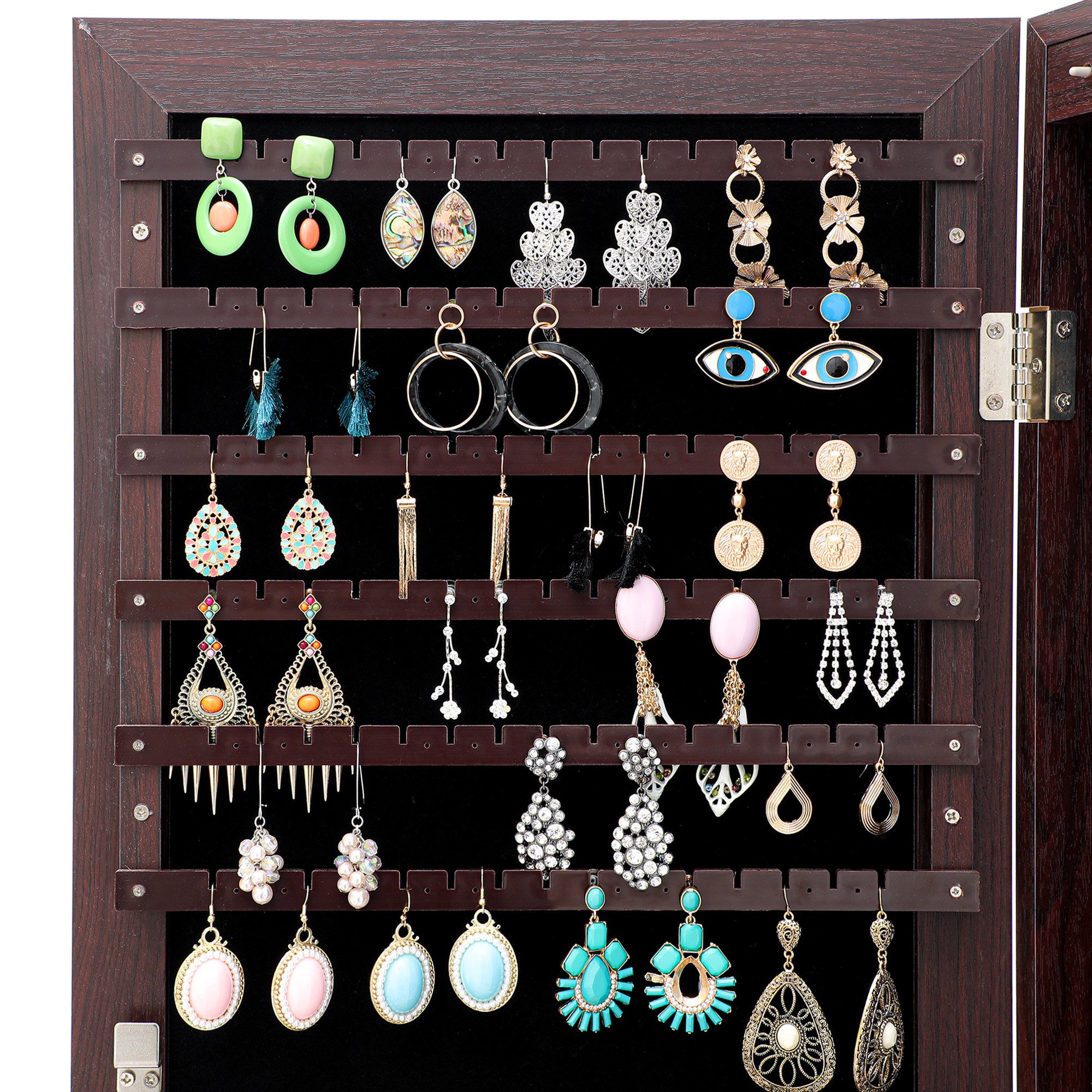 You deserve a better jewelry cabinet to storage your valuables and keep all your earrings; bracelets; chains; rings; watches in order and prevent them from getting tangled. This jewelry cabinet has 6rows for earrings; 22 necklace hooks; 2 cubes; 3 lined shelves and a bracelet rod. With a small internal mirror allows you to try on jewelry without closing the door.