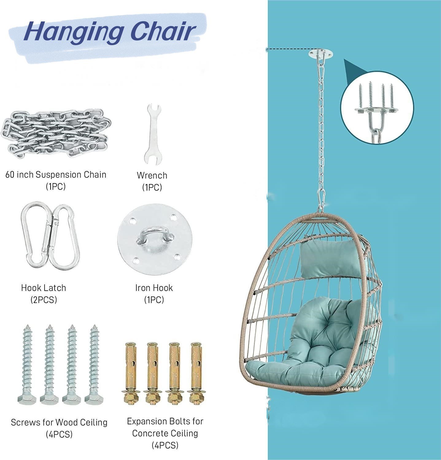 [size and Weight Capacity]The hanging egg chair size: 28.7'(W) x 28.5'(D) x 55.6'(H);. Weighs 24lbs; Weight Capacity: 280lbs.[Great for Indoors&Outdoors]Egg chair is designed to be used inside or outside; Stand and chair combo makes it easy to add a stylish seat to an apartment without having to permanently install it into the ceiling; Makes a wonderful addition to the patio, deck, garden, yard, backyard, porch, bedroom, living room and other places around your home.