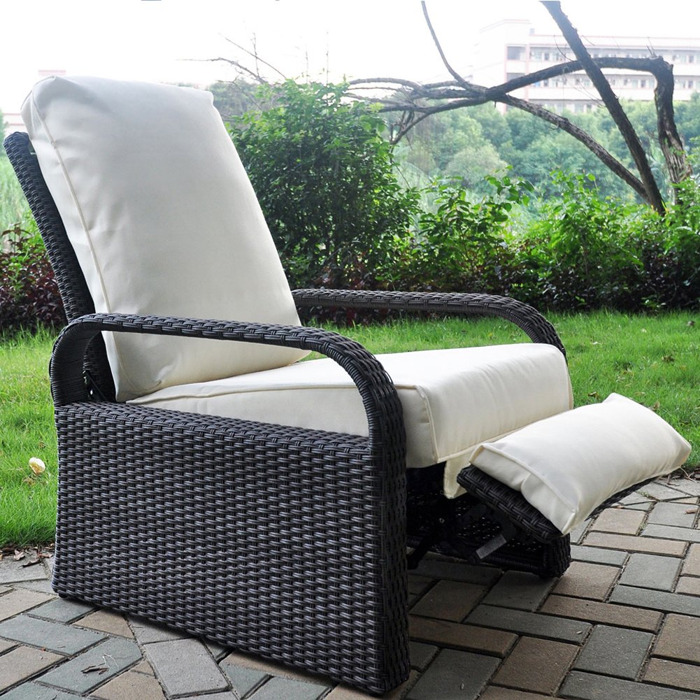 The Outdoor Wicker Adjustable Reclining Lounge Chair with footrest adjusts to 3 different positions of your choice. The soft; padded cushions of the seat and leg rest allow you to sit or lie on the chair with your whole body comfortably relaxed.The sturdy aluminum frame is made of woven PE wicker to provide superior durability and stability and also cleaning convenience.