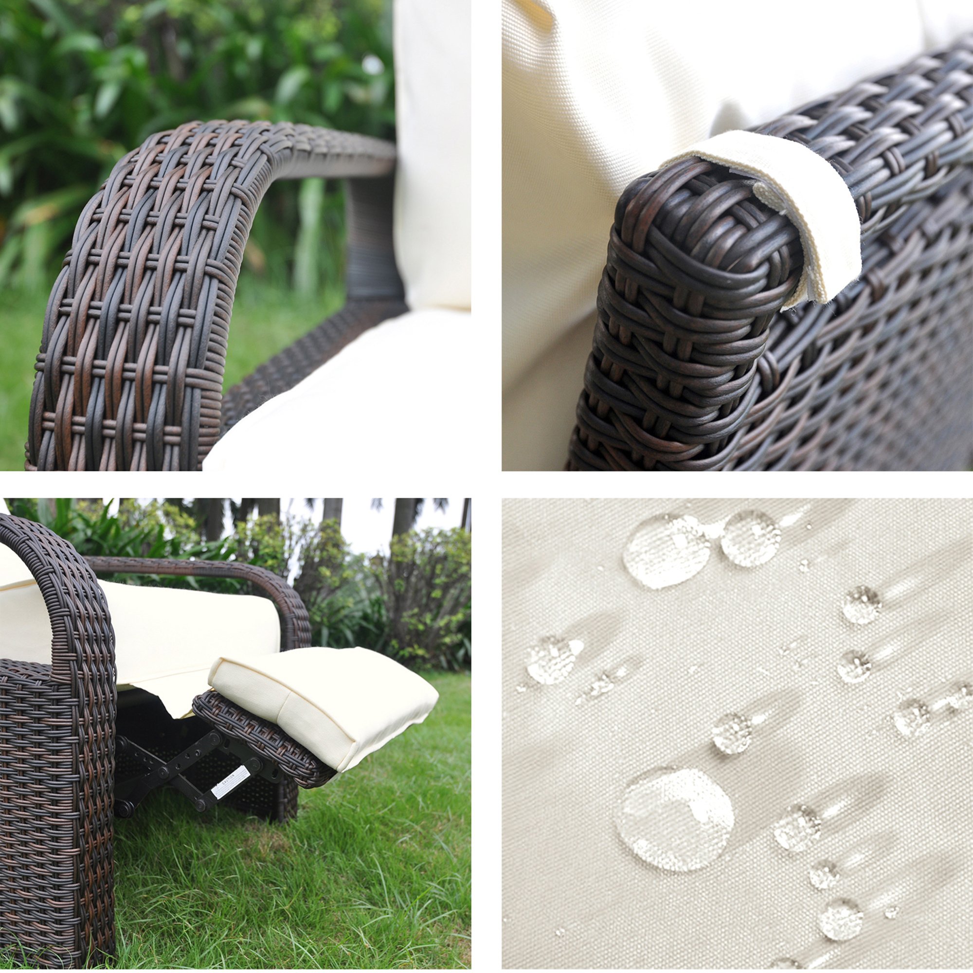 3.Wicker Recliner Chair is made from anti-rust aluminum frame wrapped in brown high quality resin wicker; the anti-rust durable aluminum frame ensures durability and supports up to 350lbs.