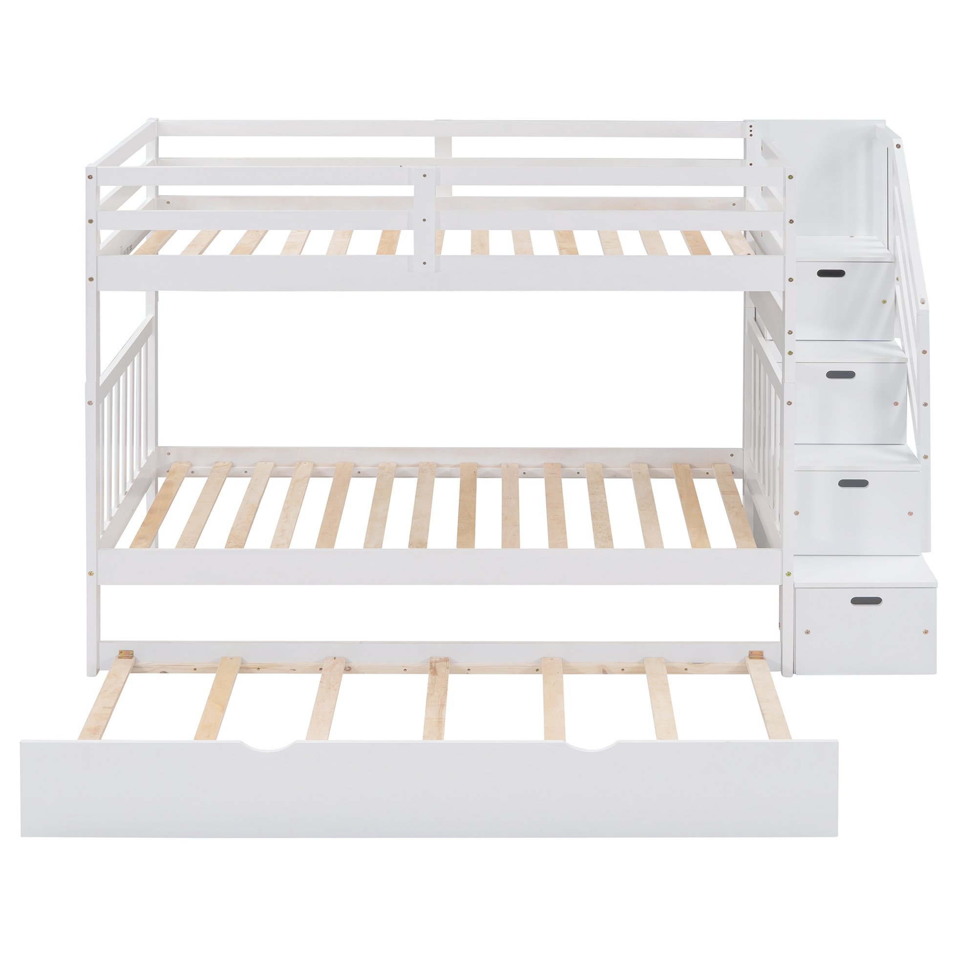 If you need extra sleeping space or your family love sleepovers, this Stairway Twin-Over-Twin or Twin over Full Bunk Bed with Twin size Trundle and Drawer is perfect for your home. Three open shelves located beneath the attached staircase and four drawers provide ample storage for your family’ toys and bedding. High-quality, solid pine legs and a strong, durable frame ensures stability and durability for long-term use. Slat kit included so box springs are not required. This bunk bed is designed with a clean silhouette and a hue of elegance. It suits all styles of home decoration, and completes the look of any bedroom.