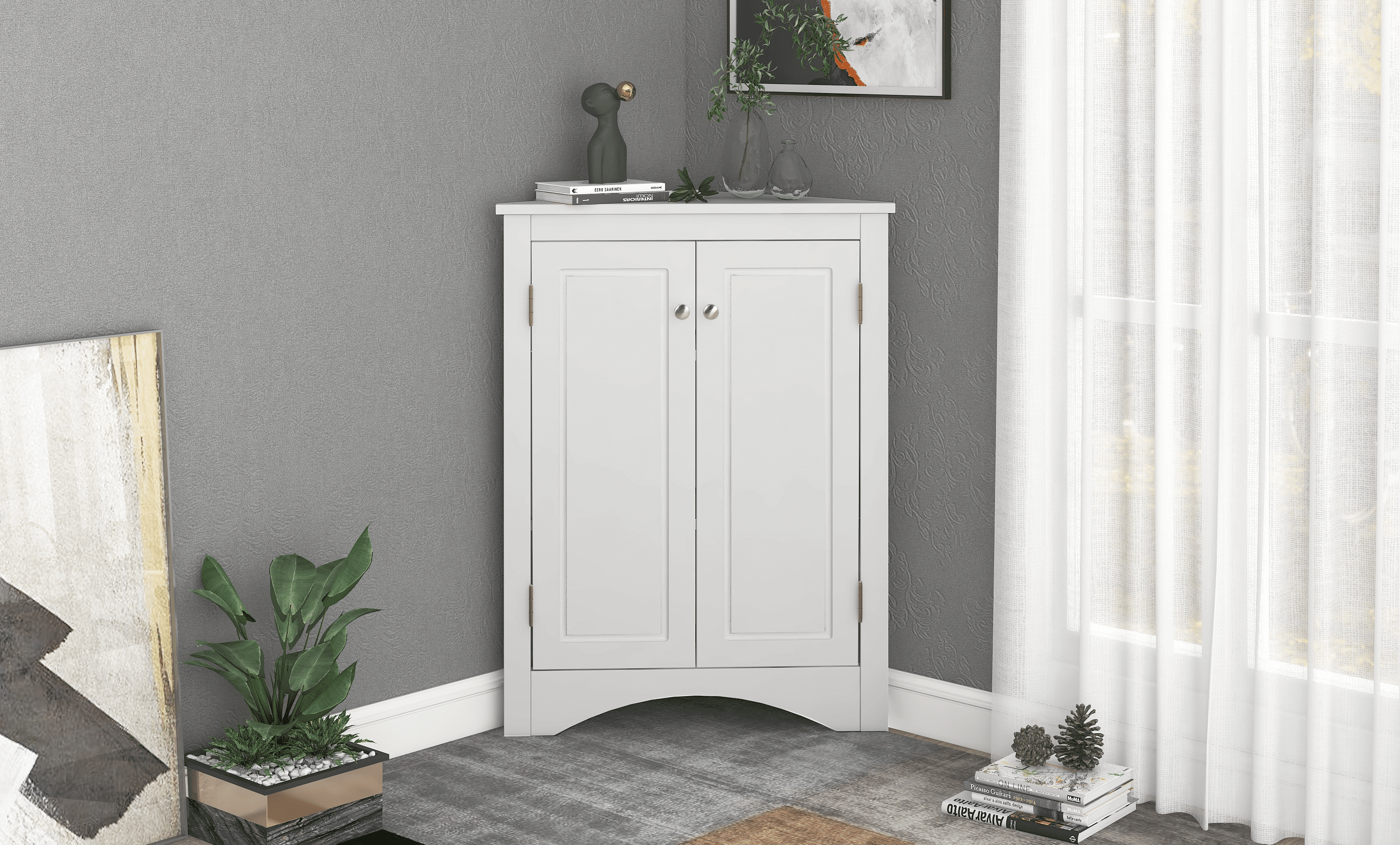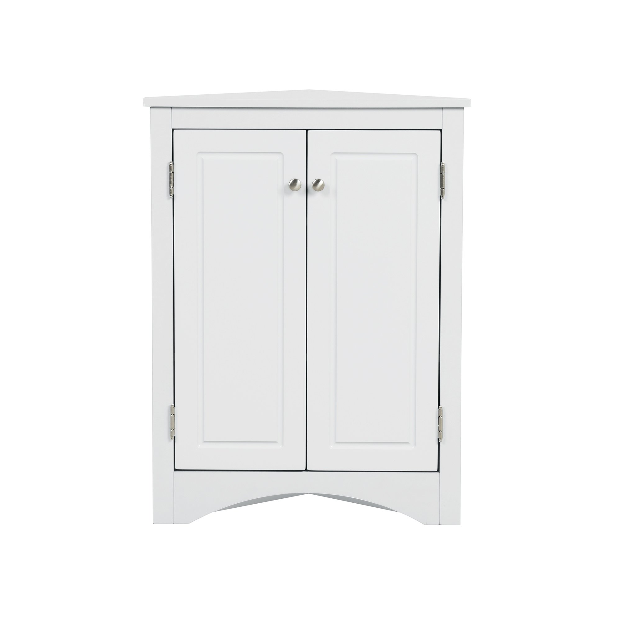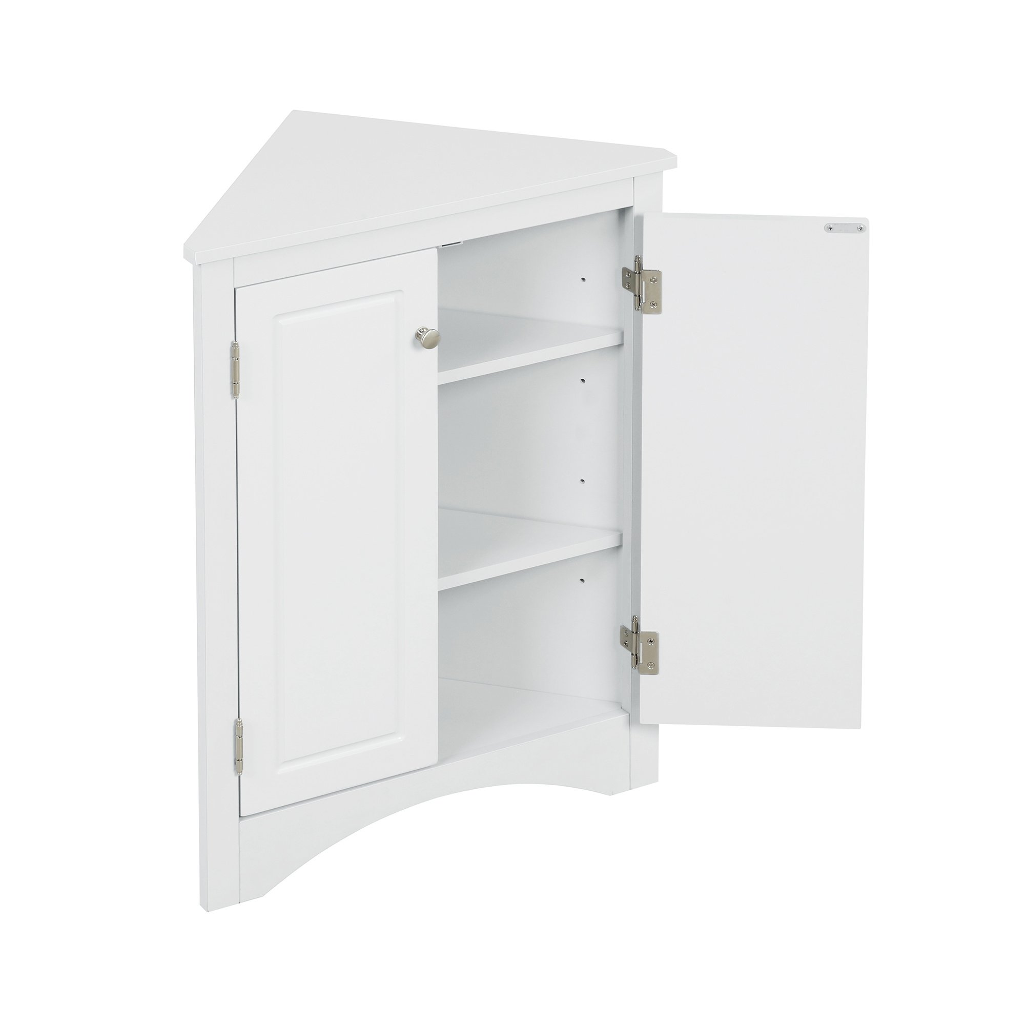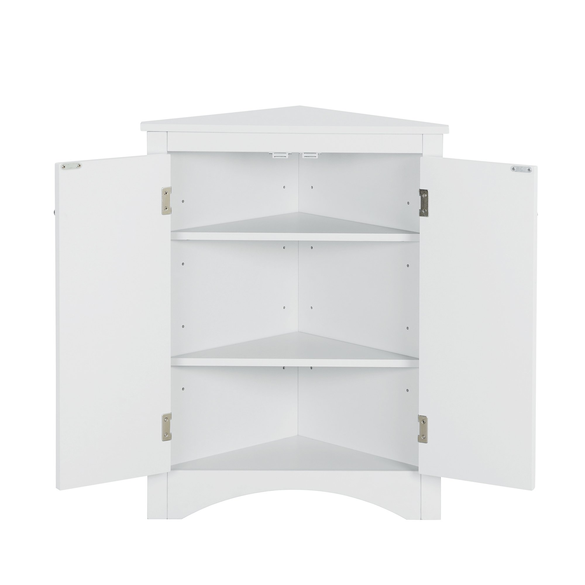 White Triangle Bathroom Storage Cabinet with Adjustable Shelves, Freestanding Floor Cabinet for Home KitchenBullet Point1. Triangle Corner Cabinet with Adjustable Shelves2. High-quality MDF Board & Metal Hardware3. Three Different ColorsDescriptionDo you want to make the most use of a corner or wall space in your house? This practical stylish cabinet is a wonderful choice for you. Large storage space can meet variety requirements in daily life, and the beautiful triangle design brings an elegant atmosphere to your house. The open design of the shelves expands the visual space, that also makes this furniture more valuable in using. These adjustable plates can change the space based on user's needs any time. Three different colors offer more options for consumers, you can pick the favorite one according to your home style. High-quality materials used for this furnishing can guarantee the stability and durability during the usage, and make daily care easier as well.Features★AFFORDABLE CABINET: This corner storage cabinet with doors is designed not only to meet your visual demands, but also to satisfy your functional needs. With inside adjustable shelves, it can meet your various storage needs. Brushed nickle knobs make it convenient for you to open and close.★STURDY & MOISTURE-PROOF: Made of high quality MDF board which is more good-quality than the usually-use particleboard in others.As the panel is waterproof, it is easy for you to maintain the wood cabinet which will even like a new one after being used for a long time. Packed with an illustrated manual, easy to Assembly.★ADJUSTABLE SHELVES: Thanks to the adjustable shelves, it can be attached to different heights so that the size of the shelves can be adapted to individual needs to make the best use of them. The storage cabinet with adjustable shelves can be put in your bathroom, laundry, pantry, living room, corridor and any other space to hold towels, toilet articles, spice jars, snacks, fruits, shoes and other items.★AMPLE STORAGE SPACE: The compact cabinet fits small spaces and adds perfect storage space to all-sized bathrooms. Hides toiletries and other bathroom items behind cabinet door for a fresh and clean appearance. The closed storage room with doors can keep your stuff dry and clean.★BEST SERVICE & GUARANTEE: Customers' satisfaction is our final goal. The guarantee period of our cabinet is 6 months, and you could contact us any time if you're not satisfied with our products. We will give you a quick response and perfect solution. Choose us now!