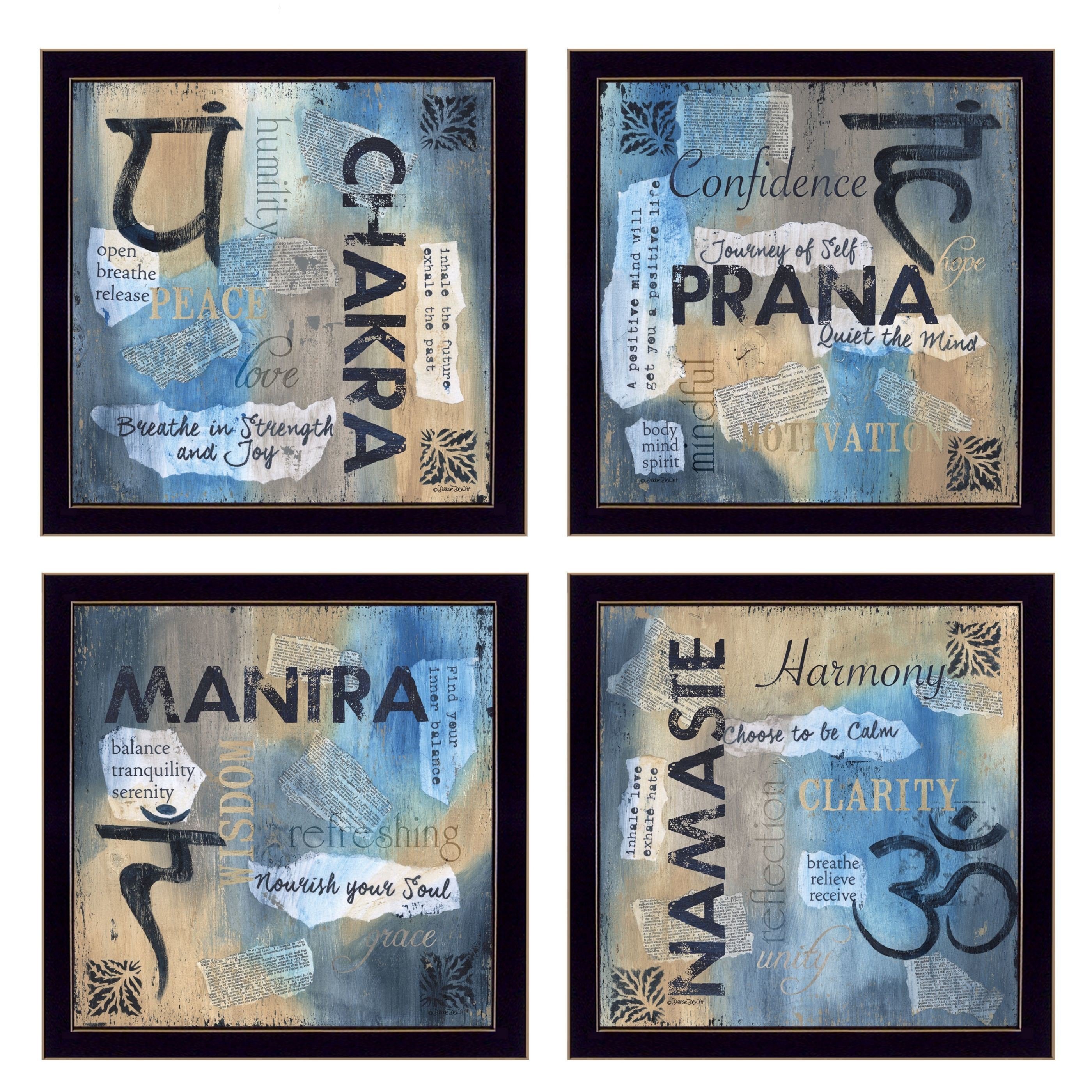 Yoga Collection, "Yoga Series-Chakra, Prana, Mantra, Namaste" is 4- 14"x14" framed art prints in a decorative black frame of the art of Debbie DeWitt. The print has a protective, archival finish (glass is not needed) and arrives ready to hang. Made in the USA with pride by skilled American workers.•Women Owned (WBE)•Textured Artwork with a 'rolled on' acid free acrylic coating to create a canvas painting effect. No glass is necessary.•UV protectant coating protects artwork from fading.•Arrives Ready to Hang